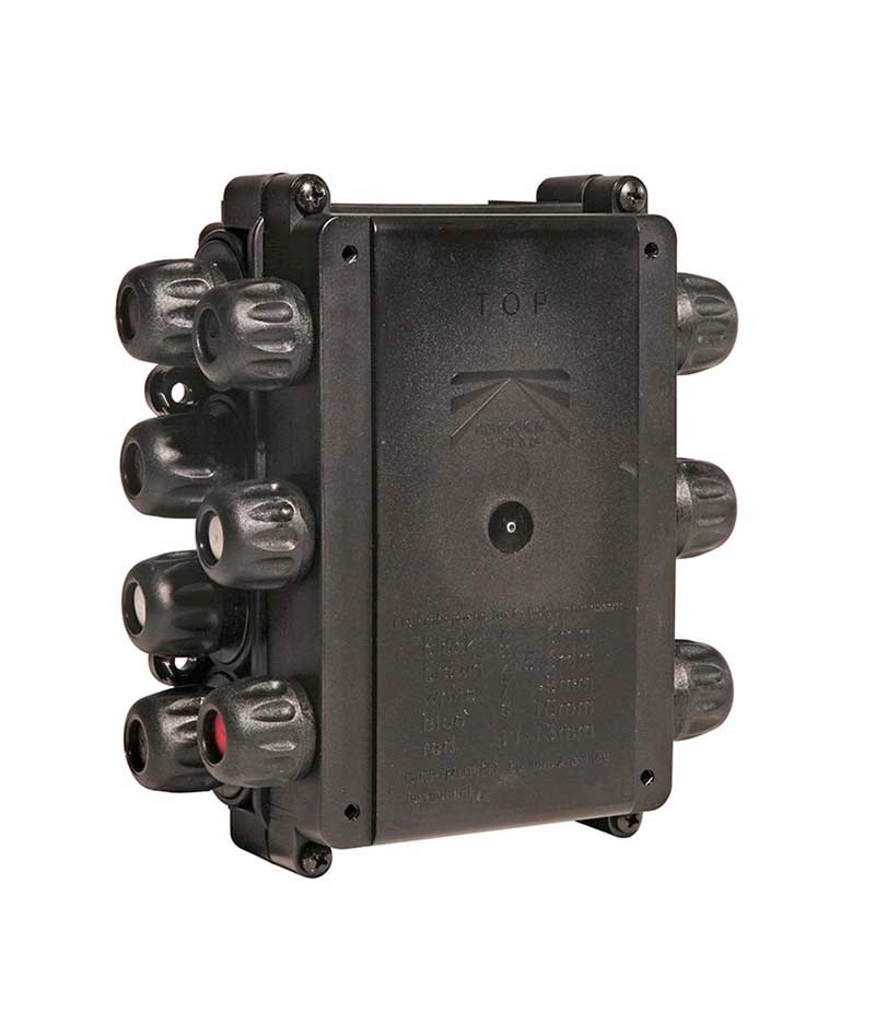 Cassetta di derivazione Aspock ass1 con 14 uscite di cui 8 applicate al corpo cassetta e 6 presenti sul coperchio aggiuntivo.Ideale per diramarazioen di segnali aggiuntivi.Grado di protezione: IP54.