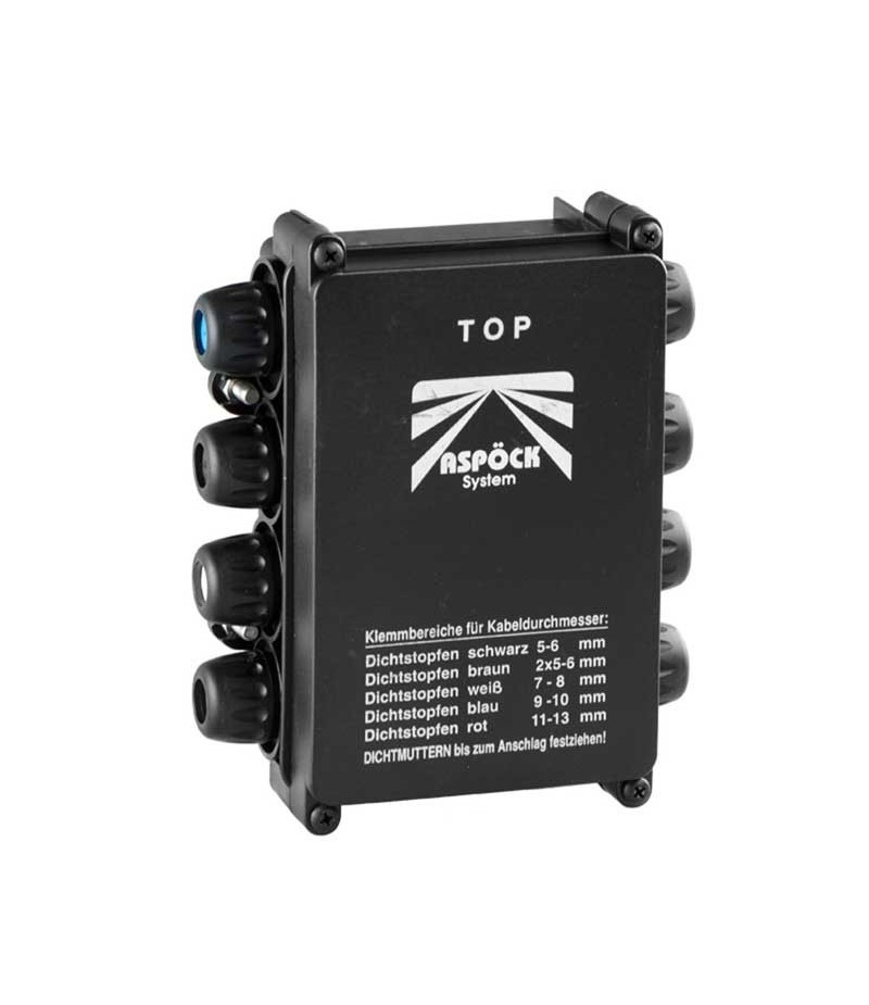 Cassetta di derivazione Aspock ass1 con 8 uscite. Ideale per diramarazione di segnali standard quali fanaleria generale. Grado di protezione: IP54.