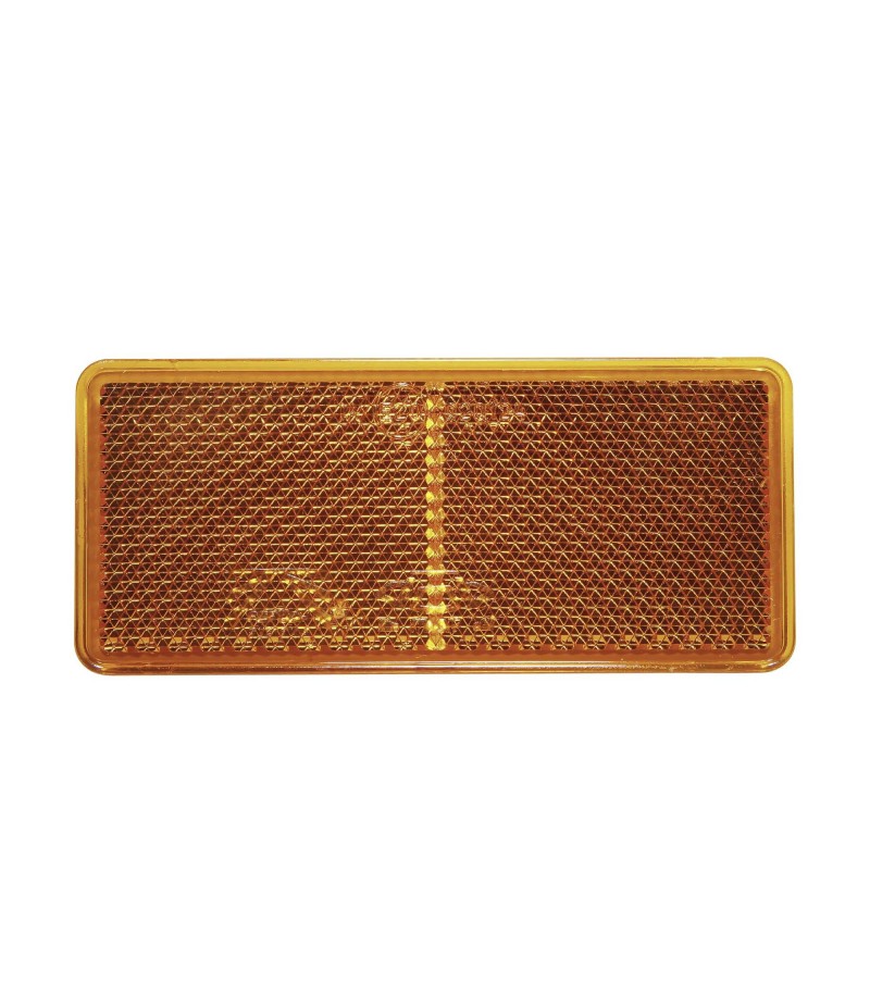 Catadiottro riflettente arancione rettangolare con fissaggio veloce tramite adesivo.