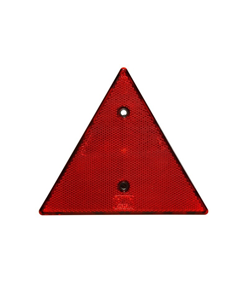Catadiottro riflettente rosso triangolare con due fori di fissaggio.