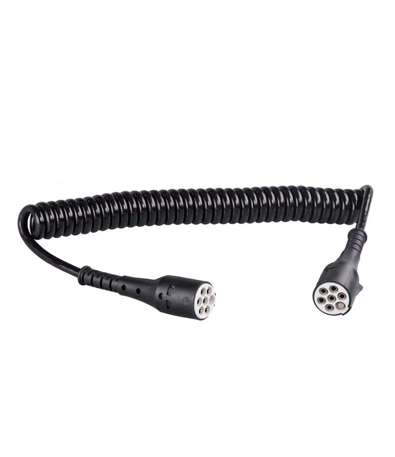 Spirale elettrica in poliuretano con spine in plastica pressofuse 24N. Cavo 6x1+1x2 connessioni iso 3731. Estensione nominale sino a 3,5m. Lunga durata e resistenza alle alte temperature.