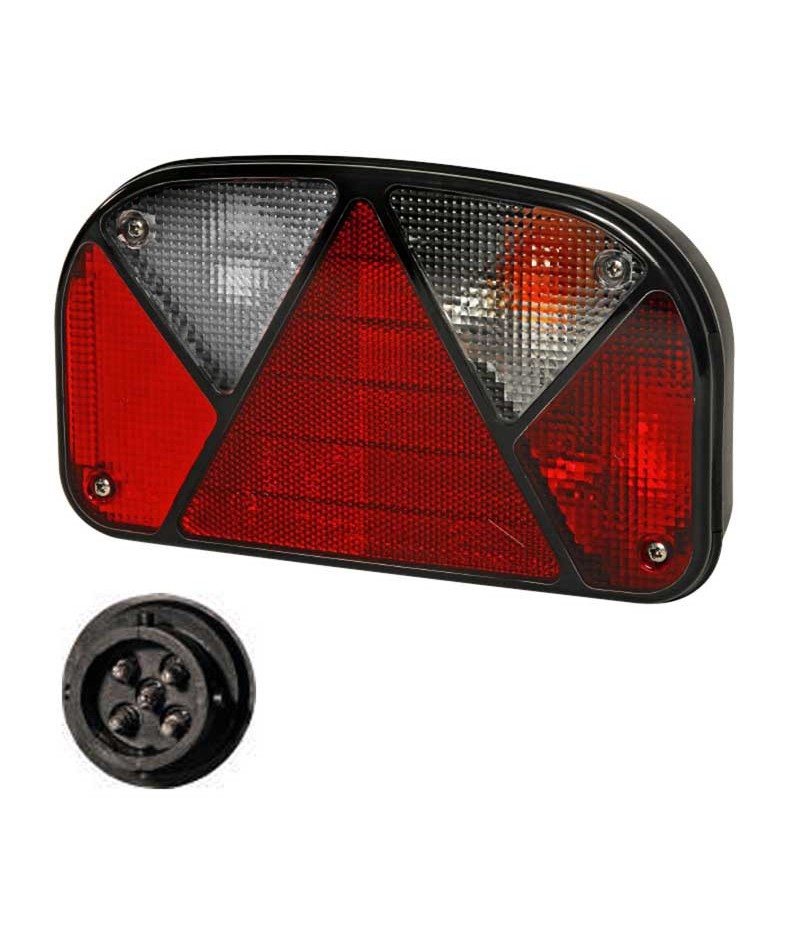 Fanale posteriore destro a lampadina 12V con funzione di posizione, stop, freccia, e retromarcia. Versione con connettore 5 poli Aspock.
