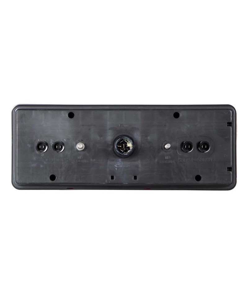 Fanale posteriore EUROPOINT 3 sinistro con connettore 7 poli e guida luce a LED e 4 connettori ausiliari. Questa versione ha integrato la luce targa a lampadina, la luce d’ingombro a LED e il cicalino per la retromarcia.