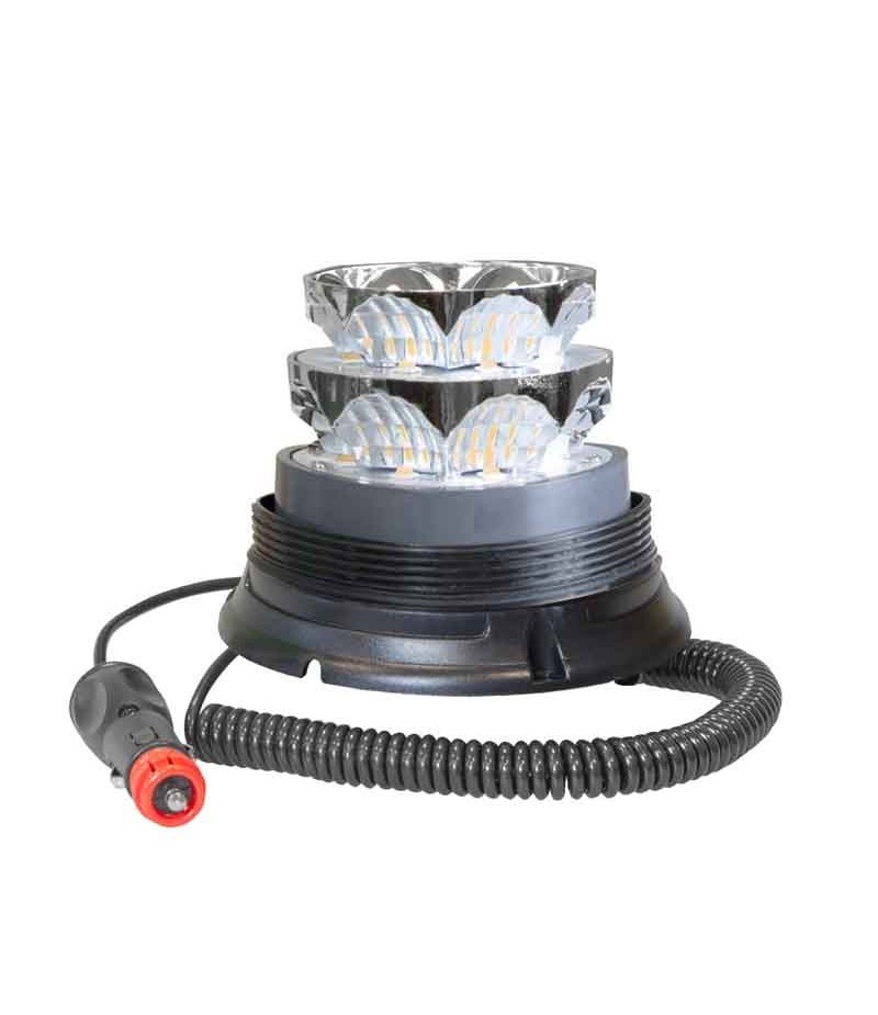Lampeggiante a LED FABRILCAR, con profilo alto. La sua caratteristica sta nelle diverse tipologie di luce: luce rotante, flash singolo, doppio e flash di tipo veloce. Ha un consumo di soli 12W una resistenza agli agenti atmosferici IP67. Tra le sue qualità annovera le certificazioni: ADR zone 2, ER10, ER65 (solo con funzione rotante) e EMC. Può funzionare con voltaggi che vanno da 9 a 30V e temperature tra -30 e +50°. Viene fornito con installazione a 3 viti base magnetica e cavo spiralato con connessione per accendisigari da 3,50m.